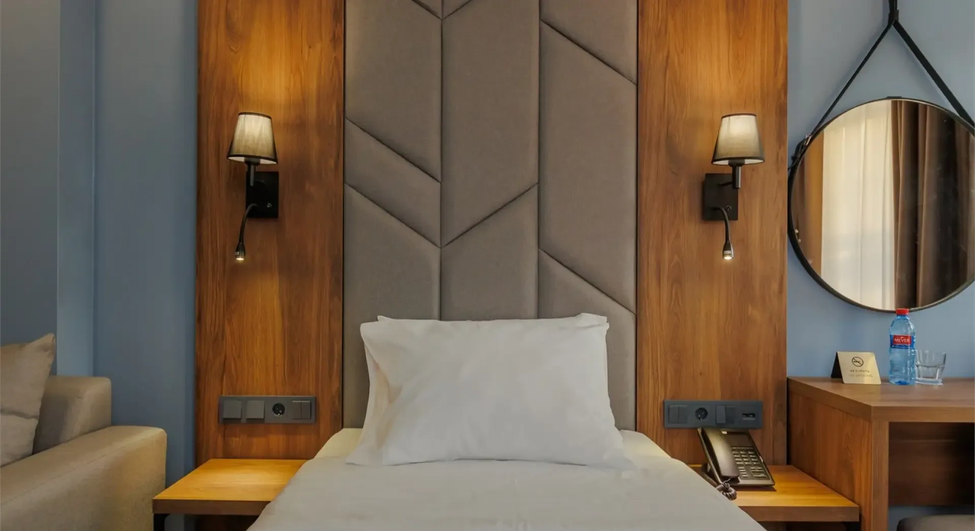 Оптимальное решение для деловых поездок. В номере удобная односпальная кровать, рабочее место, вместительный гардероб и всё необходимое для проживания.